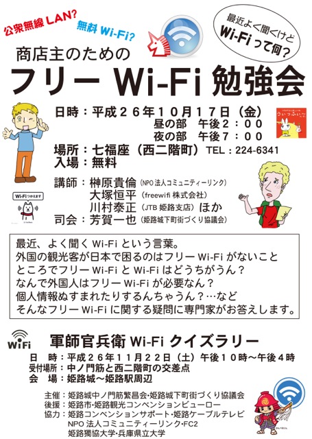来たる10月17日(金)午後2時と7時の2回、西二階町の七福座でフリーWi-Fi勉強会を開催します。